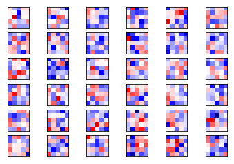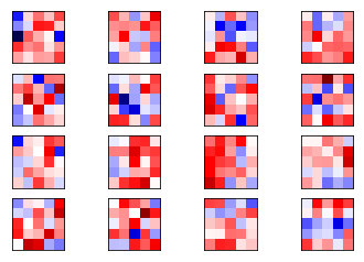 Ahora grafica los pesos de los filtros para la segunda capa convolucional. Dado que hay 16 canales de salida desde la primera capa convolucional, entonces tendremos 16 canales de entrada para la segunda capa convolucional. La segunda capa convolucional tiene un conjunto de filtros de los pesos para cada uno de sus canales de entrada. Comenzamos por graficar los pesos del filtro para el primer canal. Note nuevamente que los pesos positivos son rojos y los pesos negativos son azules.
