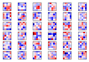 Ahora mostramos los imágenes de los pesos de los filtros en la primera capa de convolución de la red (rojo para valores positivos y azules para valores negativos):