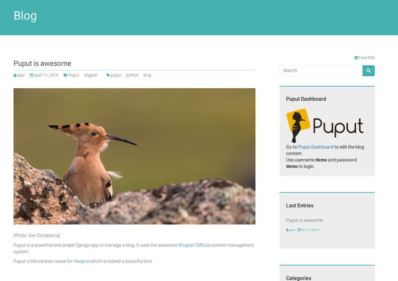 So that’s why we selected Wagtail as our main tool to develop CMS/blog sites. In the other hand the default behaviour of Wagtail to structure pages and urls is more similar to a tree structure: section/subsection/subsubsection. So if we want to build a blog with url structure like Wordpress or Blogger this doesn't seems a proper way. That’s why we developed Puput: a plugin for Wagtail that creates a blog site in a Django project (with a default template too!).