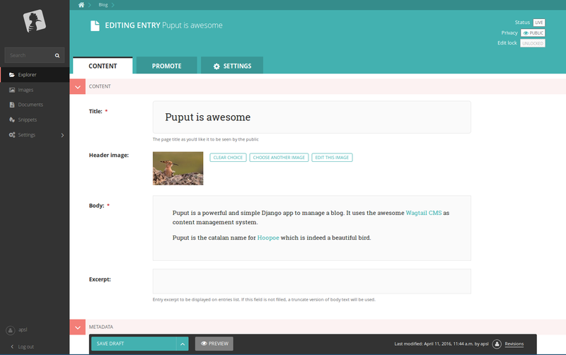 So that’s why we selected Wagtail as our main tool to develop CMS/blog sites. In the other hand the default behaviour of Wagtail to structure pages and urls is more similar to a tree structure: section/subsection/subsubsection. So if we want to build a blog with url structure like Wordpress or Blogger this doesn't seems a proper way. That’s why we developed Puput: a plugin for Wagtail that creates a blog site in a Django project (with a default template too!).