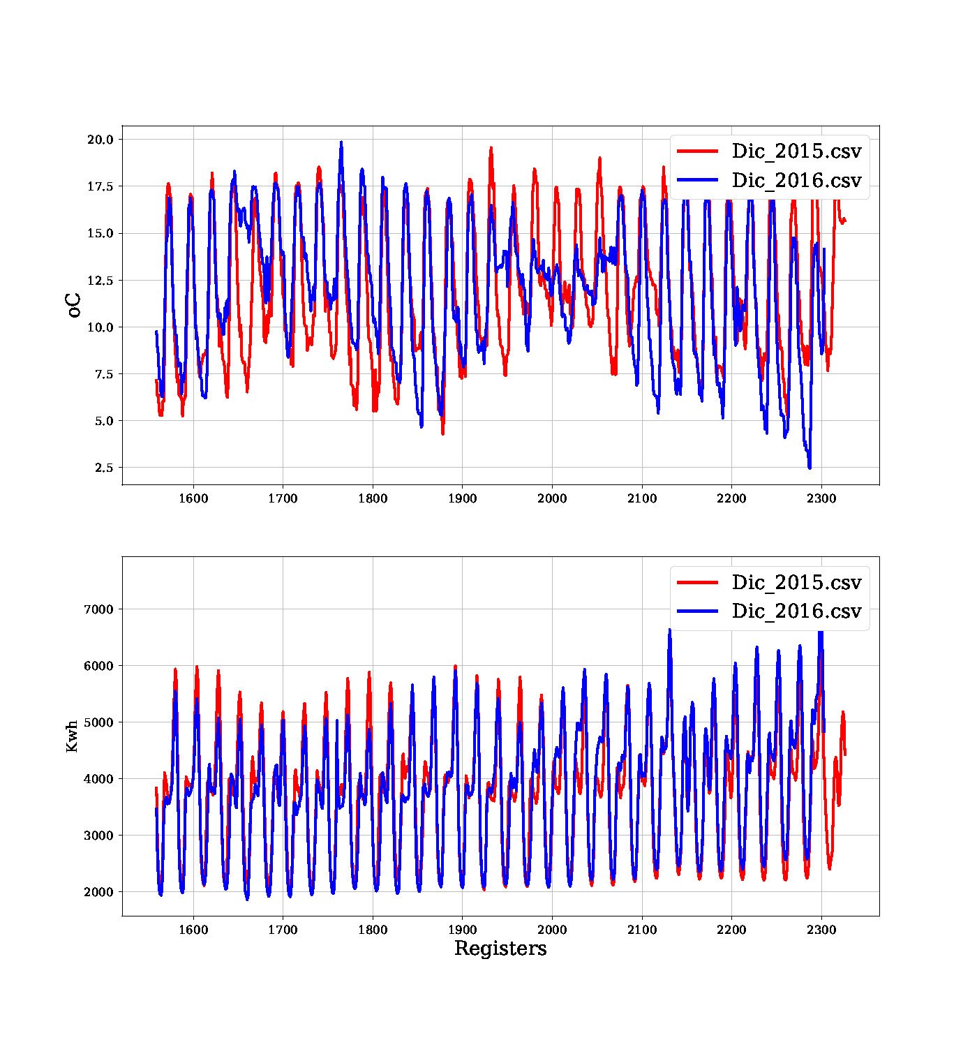 Para enfatizar esta dependencia entre ambas series, en la figura 2 dibujamos la serie histórica de la temperatura y la del consumo eléctrico del mes de diciembre del 2015, y las del mes de diciembre del 2016. Estas curvas las hemos superpuesto para hacer un análisis comparativo de ambas series. Observando el panel inferior de la figura 2 en donde se analiza la superposición de las dos series en el consumo eléctrico, se percibe claramente que la forma de la curva en las series sigue un patrón similar, sin embargo es preciso señalar que los valores en cierto tramos de la serie no coinciden.