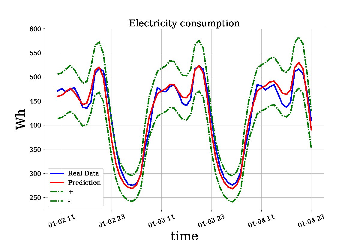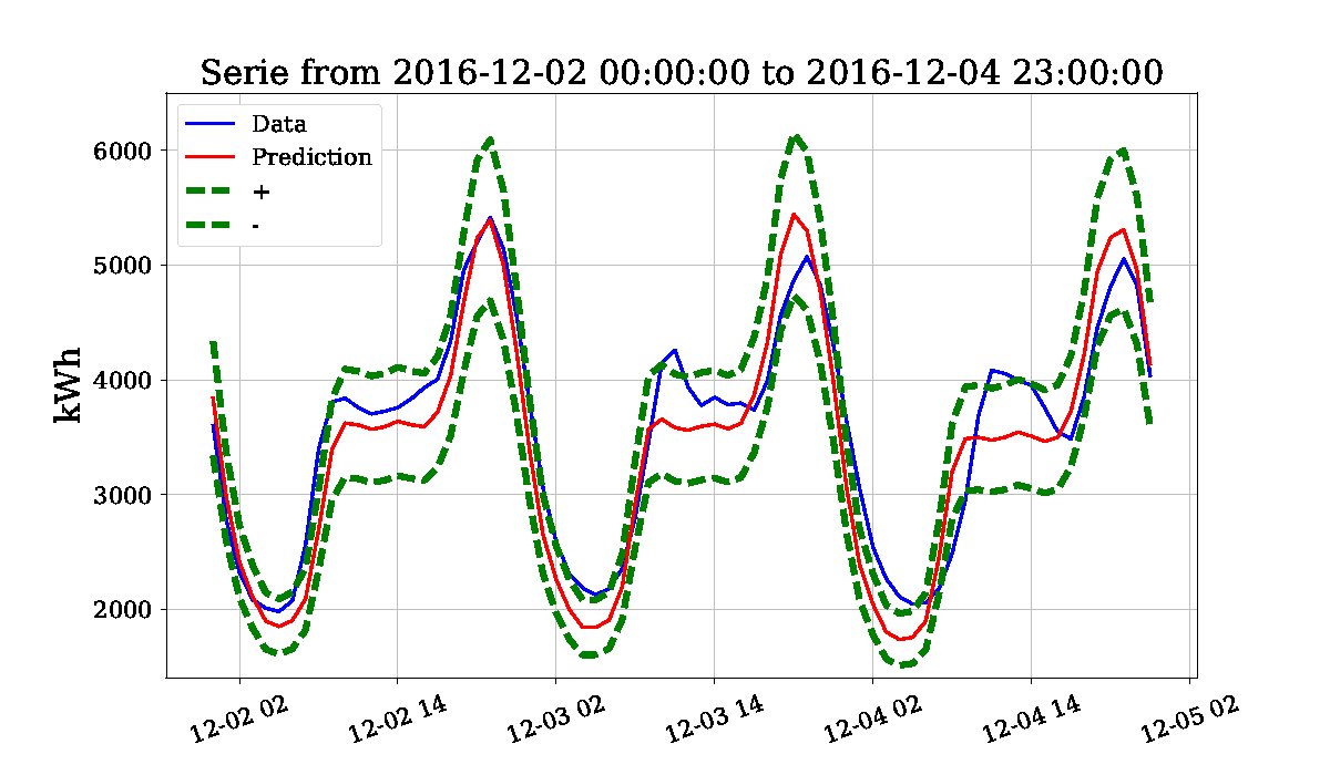 Fig. 4. Serie temporal del consumo eléctrico. Línea azul corresponde a los datos reales. Línea roja corresponde a la predicción del modelo RNN-LSTMs. Las líneas punteadas corresponden al intervalo de confianza del modelo.