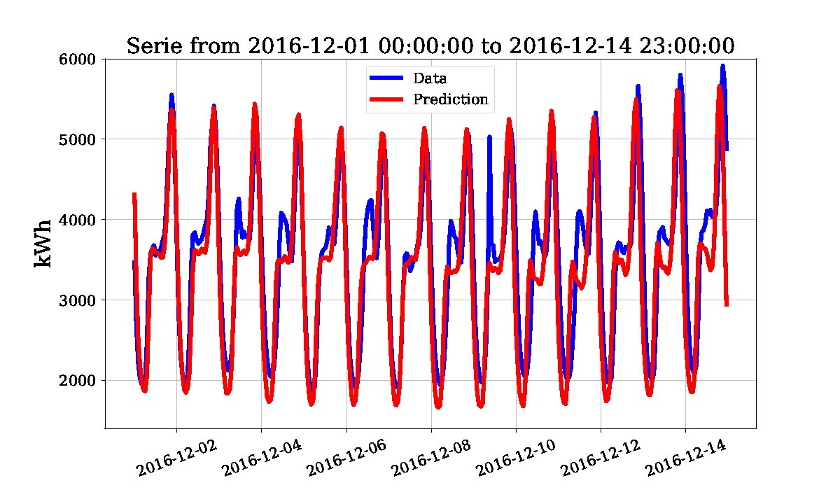 Fig. 6. Serie temporal del consumo eléctrico. Línea azul corresponde a los datos reales. Línea roja corresponde a la predicción del modelo RNN-LSTMs. Las líneas