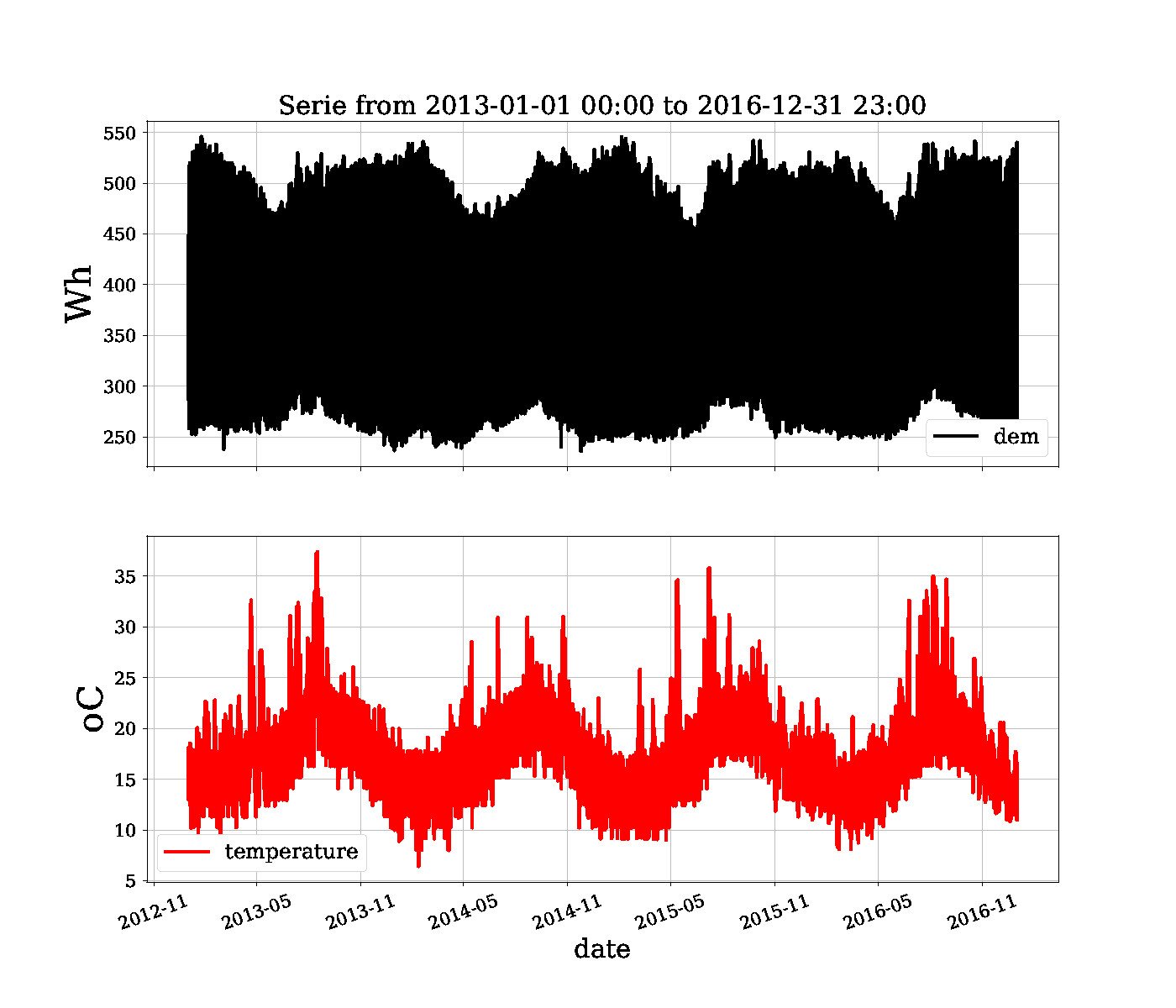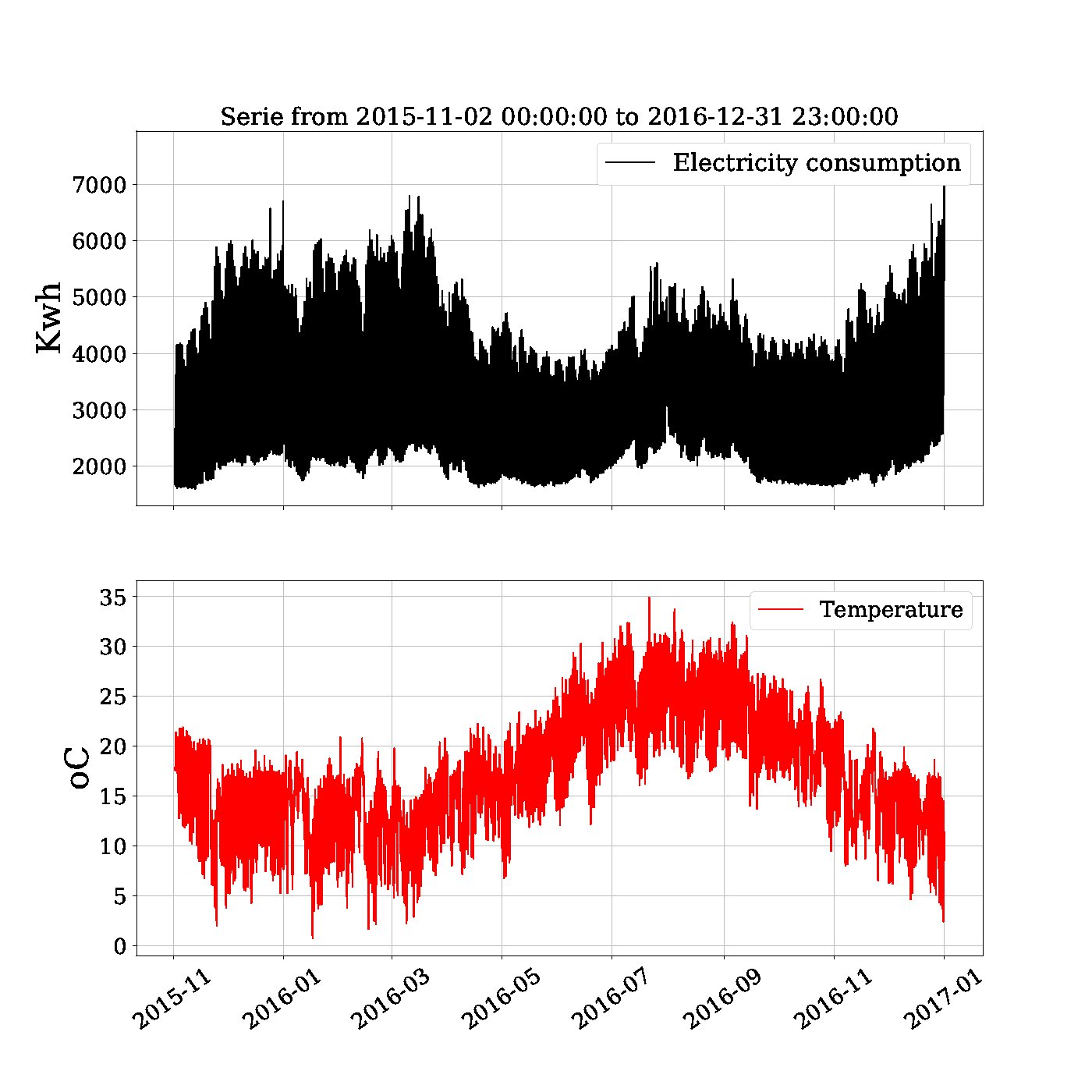 Fig. 5. Panel superior: Serie temporal del consumo eléctrico en Kwh. Cada registro corresponde a la suma total del consumo eléctrico de todos los Usuarios registrados. Panel inferior: Serie temporal de la temperatura en grados Celsius. Periodo de tiempo 01/01/2013 - 31/12/2016.
